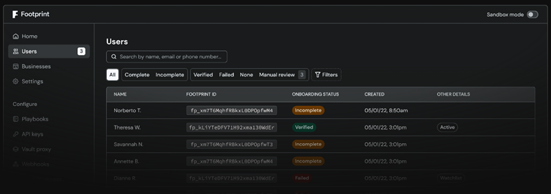 Footprint’s ‘identity infrastructure’ is designed to grow your business by simplifying complex onboarding and automating KYC and KYB processing. With built-in fraud detection, it helps prevent and protect against fraud and other financial crimes.