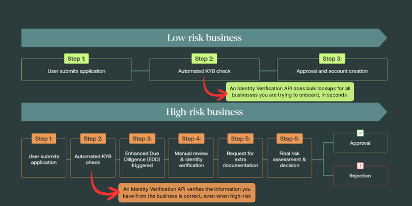 An identity verification API is best used at the beginning of the process as an early indicator. The automated KYB check can either auto-approve low-risk entities to be onboarded immediately or escalate high-risk entities to further screening. This way, more rigorous, manual reviews are reserved for extreme cases — saving your team significant time and resources.
