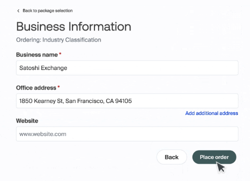 Finally, all you need to do is input the company’s name, address, and (optionally) website URL. Then click Place Order.