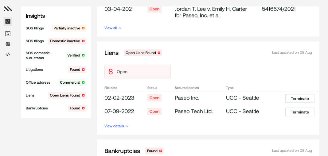 Just because you onboard a business today, that doesn’t mean they’ll remain in good standing forever. Business lien searches allow you to check for liens filed against a company. Automated lien monitoring ensures you get updated when there’s a change, so you can adjust the businesses risk profile accordingly.