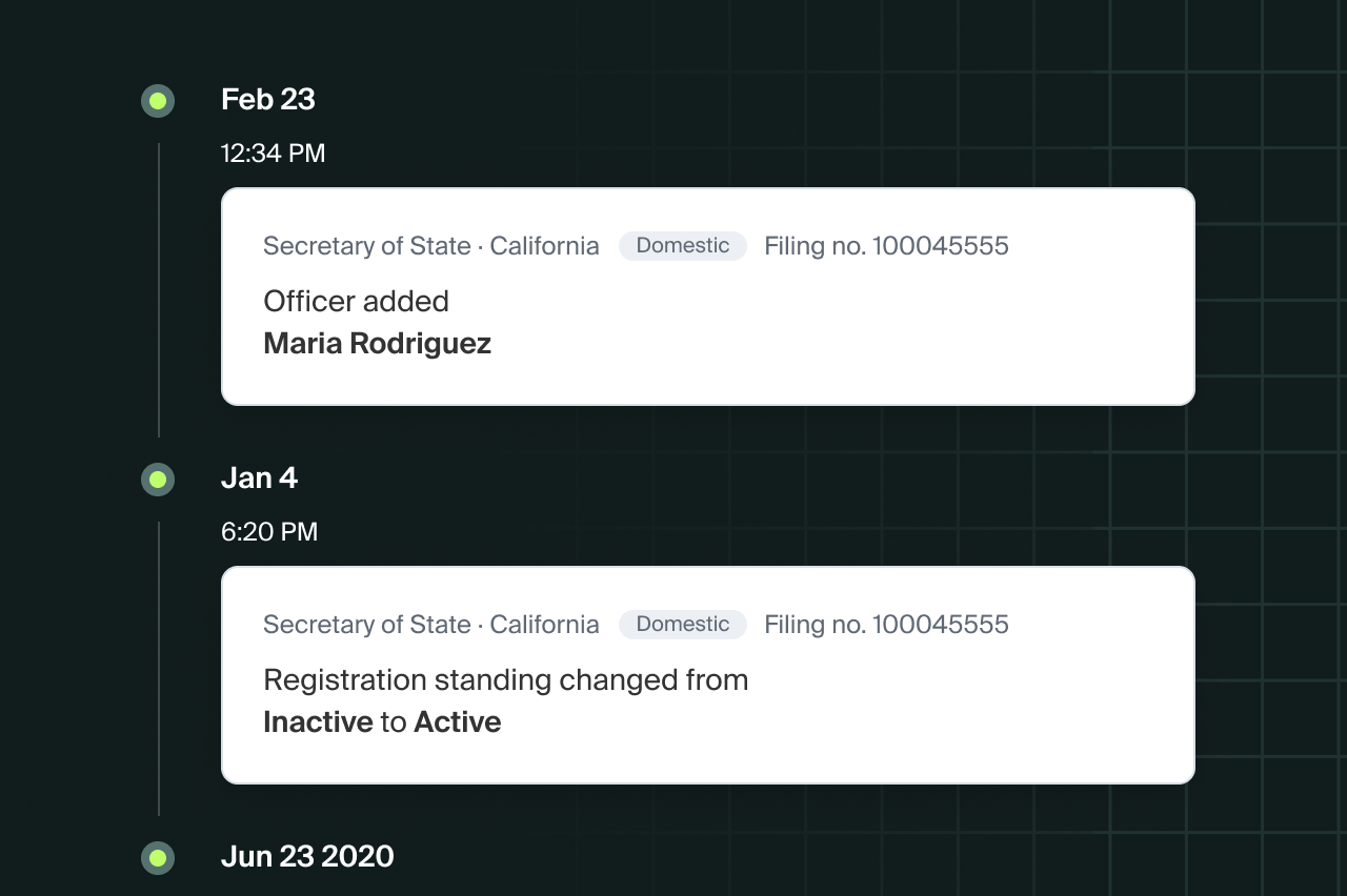 One chronological view of all SOS changes. Reveal shelf companies, synthetic identities, and fraud patterns that point-in-time checks miss.