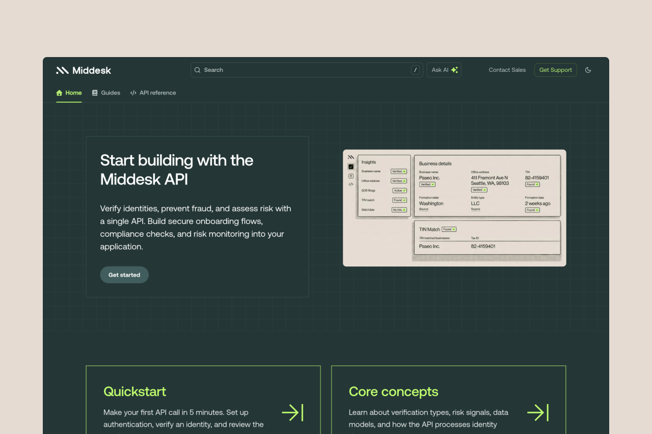 Our new docs include 100+ product guides and 56 API endpoints, rebuilt to support technical evaluation and integration across Middesk.