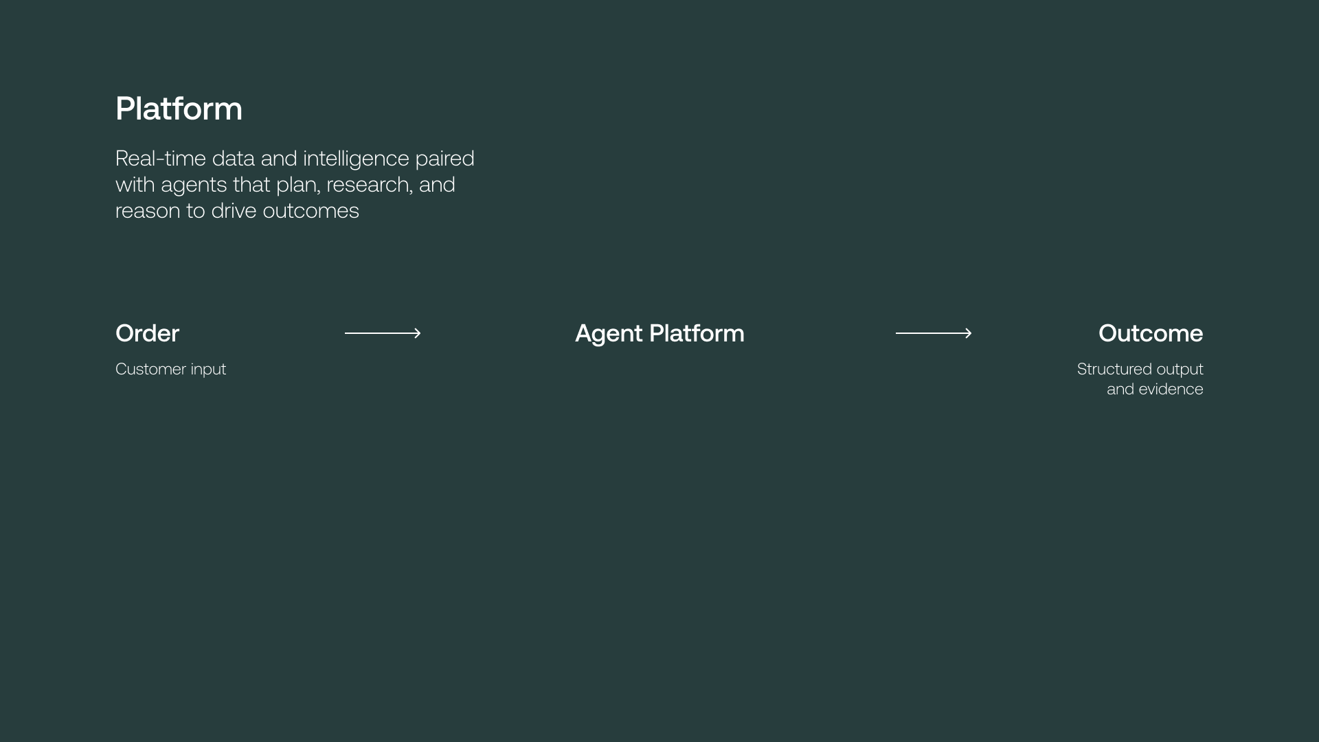 Data acquisition beyond cached sources. When information isn't immediately available, agents explore and develop what's needed at the time of the order - researching, retrieving, and validating in real-time. Not static lookups, but rather, live investigation.